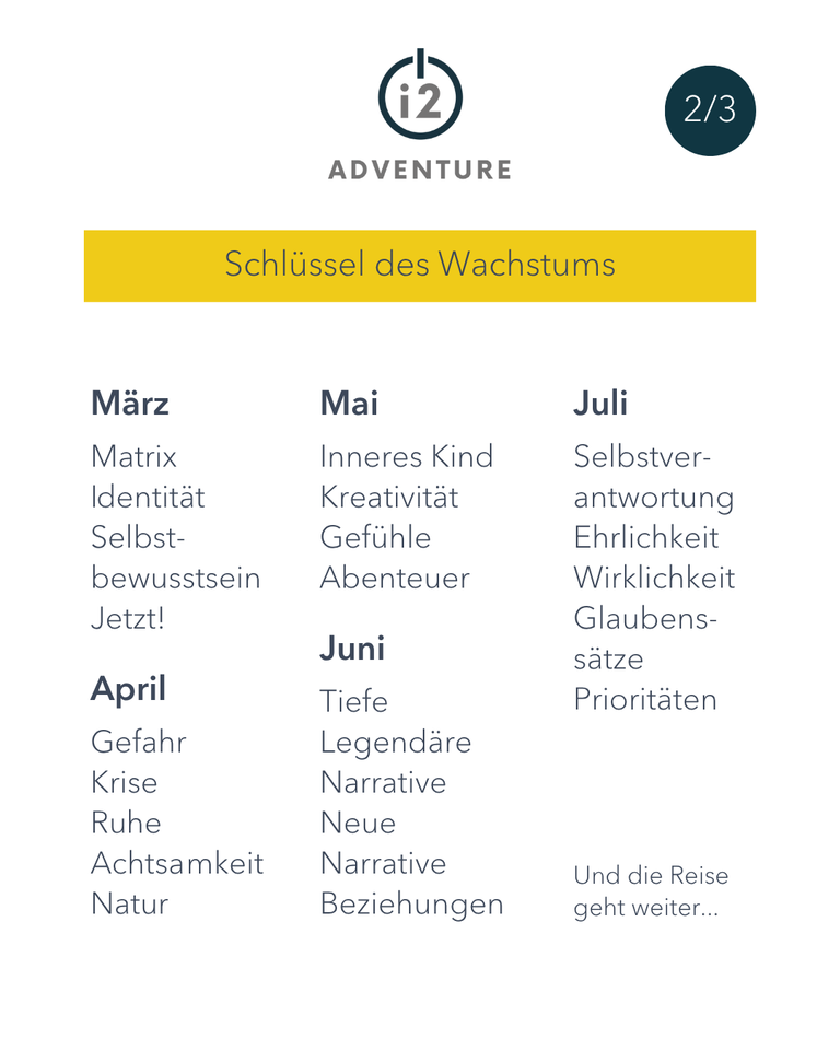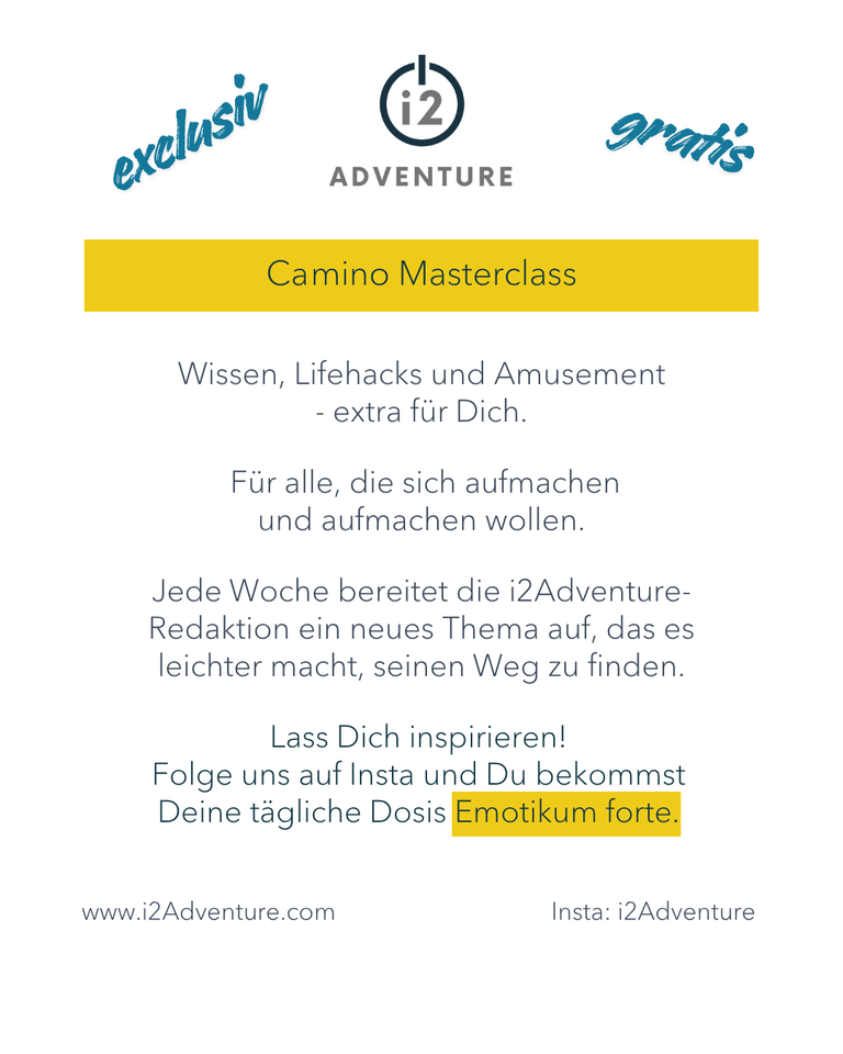 Hier im Blog findest Du die Highlights der Camino Masterclass. Auf dem Insta-Kanal von i2Adventure findest Du das volle Programm. Du öffnest quasi jeden Tag ein Türchen und bekommst exklusive Einblicke in den Maschinenraum der menschlichen Psyche und dazu Ideen, wie man sich das Leben leichter machen kann. Schon neugierig? Dann schau vorbei!