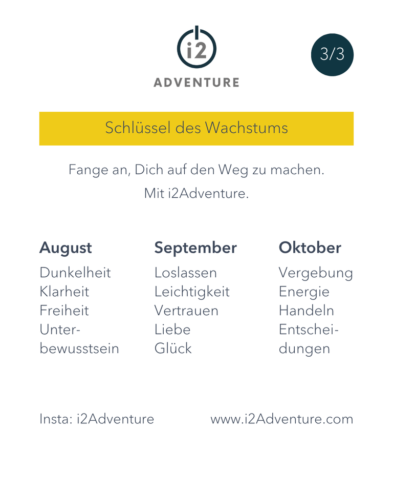 Das Ziel ist, #Momentum aufzubauen. Momentum ist eine Mischung aus #Kraft und Geschwindigkeit, also Energie, die einem Kurs folgt und auf ein Ziel gerichtet ist. Durch Wiederholungen und Üben sorgt man selbst dafür, dass eine Welle entsteht, auf er man surfen kann. Viel zu leicht tappt man in die Falle, etwas einmal getan zu haben, sich davon wundersame Veränderungen zu versprechen und sich enttäuscht zurückzuziehen, wenn man doch keinen Nobelpreis oder was auch immer gewonnen hat. Persönliches Wachstum ist Arbeit und setzt eine gewisse Anstrengungsbereitschaft voraus. Das innovative Programm von i2Adventure unterstützt Dich dabei, beweglich am Ball zu bleiben und diesen einen Extra-Schritt zu tun, der Dich wirklich voranbringt. Ein Caminero (= macht einen Jakobsweg) ist ein Anfänger. Er fängt an, er fängt an seinen Weg zu gehen und den nächsten Schritt zu machen. Einfach nur den nächsten Schritt. Konsistenz ist wichtiger als Talent. Die Kunst liegt darin, vorhandene Energie in die richtigen Bahnen zu lenken und sie nicht auf unproduktiven Nebenkriegsschauplätzen zu verplempern. i2Adventure unterstützt Dich dabei, die Klarheit zu finden, das eine vom anderen zu unterscheiden.