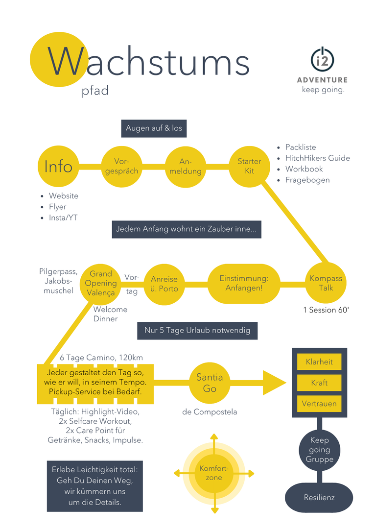 Mit i2Adventure machst Du eine kondensierte Camino-Erfahrung in 6 Tagen. Das Programm bietet Dir dafür einen sicheren Rahmen und vielfältige Impulse, die Dich beflügeln, zum Nachdenken bringen und manchmal auch unter die Haut gehen. Das ist kein klassisches Coaching, eher eine Begleitung, um die wichtigen Fragen für diese einzigartige Reise zu sich selbst zu finden. So kannst Du in kurzer Zeit das erleben, was einen Camino ausmacht und mit diesen Einsichten Dein Leben neu anmalen. Vielleicht in bunt?