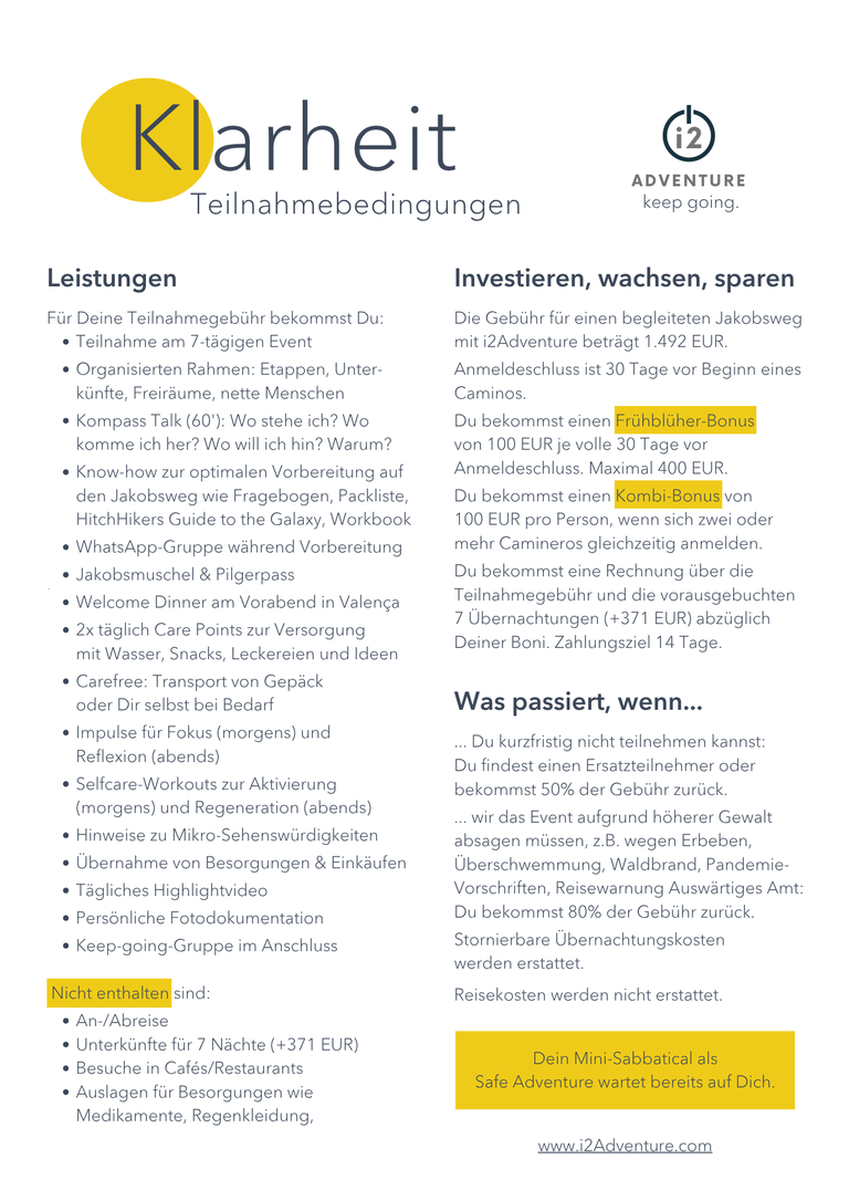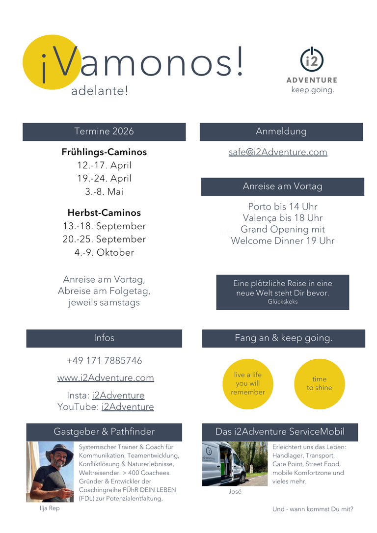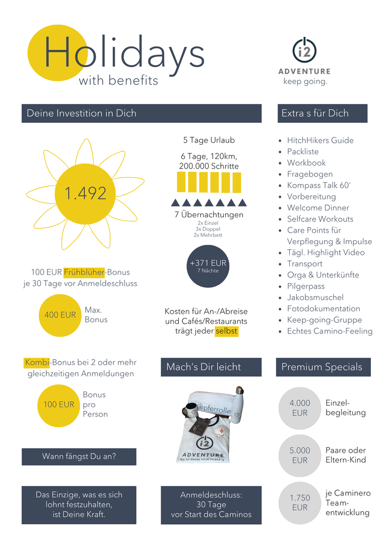 Komm mit auf die spannendste Reise, die es gibt - die zu Dir selbst. Auch wenn wir eine Gruppe von 3-7 Pilgern sind, geht jeder seinen eigenen Weg. Ob mit anderen oder allein, alles ist fein. Ob zügig oder gemächlich - Du entscheidest. Was Du brauchst, weißt am Ende nur Du selbst. i2Adventure organisiert für Dich alles Wichtige drumherum, damit Du Dich auf Deinen Weg einlassen kannst. It's a hassle-free philosophy.