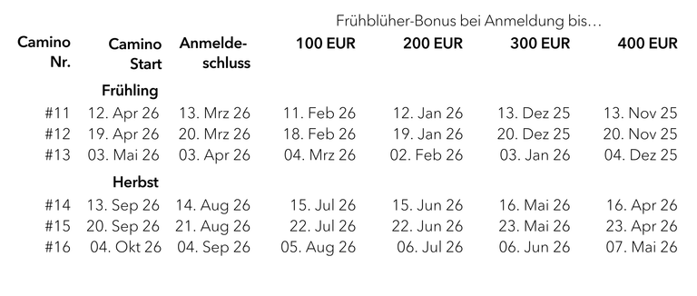 Je 100 EUR für je 30 Tage bei verbindlicher Anmeldung vor Anmeldeschluss (30 Tage vor Start Deines Caminos).
